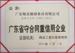 本公司生產的雁球牌米排粉,采用優質大米、高山天然山泉水,經科學配制,嚴格的衛生條件里精制而成。該產品有營養豐富,口感滑爽,食用方便,能蒸、能泡、能炒等特點,既能做成各種花式的美餐,同時還便于保存,久不變質。該產品除滿足梅州地區外,還遠銷廣州、深圳、江西、福建等地,特別是海外華同胞品嘗了雁球牌米排粉后,更是交口稱贊。雁球牌米排粉在2001年被國家產品質量保障中心和國家名優產品認定中心授予“中國名優產品”,2002年被國家中輕產品質量保障中心授予“消費者滿意產品證書”。同時公司早在1999年就被國家農業部授予“全面質量管理達標證書”。公司連續多年被市、縣評為文明單位,2003年被梅州市政府授予連續五年“重合同守信用企業”。